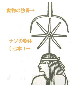 セシャトの頭の上にのっかってる、ナゾのものについては今のところ、「正体不明」ということになっているが、どうやら彼女の古い「標章」らしい。まるく湾曲しているのは、動物の左右の肋骨。その下にあるもの(必ず七本が花びらのように並べられている)は、拡大すると直立した棒に結び付けられているように見えることから、やはり何かの骨ではないかとされる。